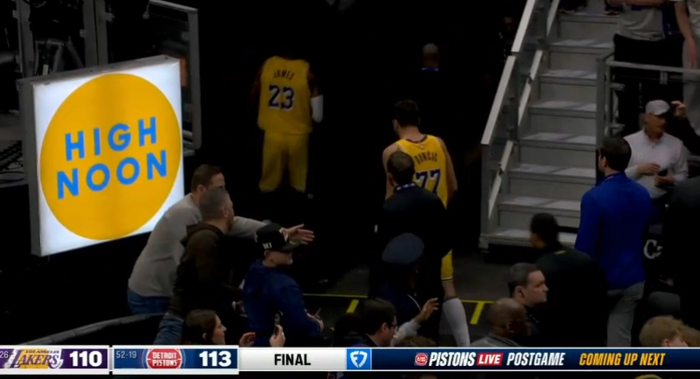末节湖人和活塞打得十分胶着,东契奇和詹姆斯带队紧咬比分,比赛还剩2分39秒湖人追平比分,哈里斯得分止血,艾顿四罚三中助湖人反超1分,詹金斯两罚全中,里夫斯抛投得分再次反超,詹金斯中投命中,东契奇错失续命球,湖人采用犯规战术,詹金斯两罚全中,最后9秒湖人落后3分,之后东契奇绝平三分三不沾,最终湖人客场惜败活塞,赛后东詹沮丧离场。